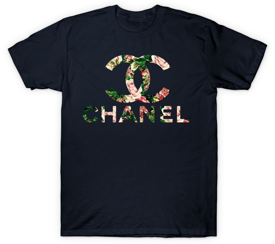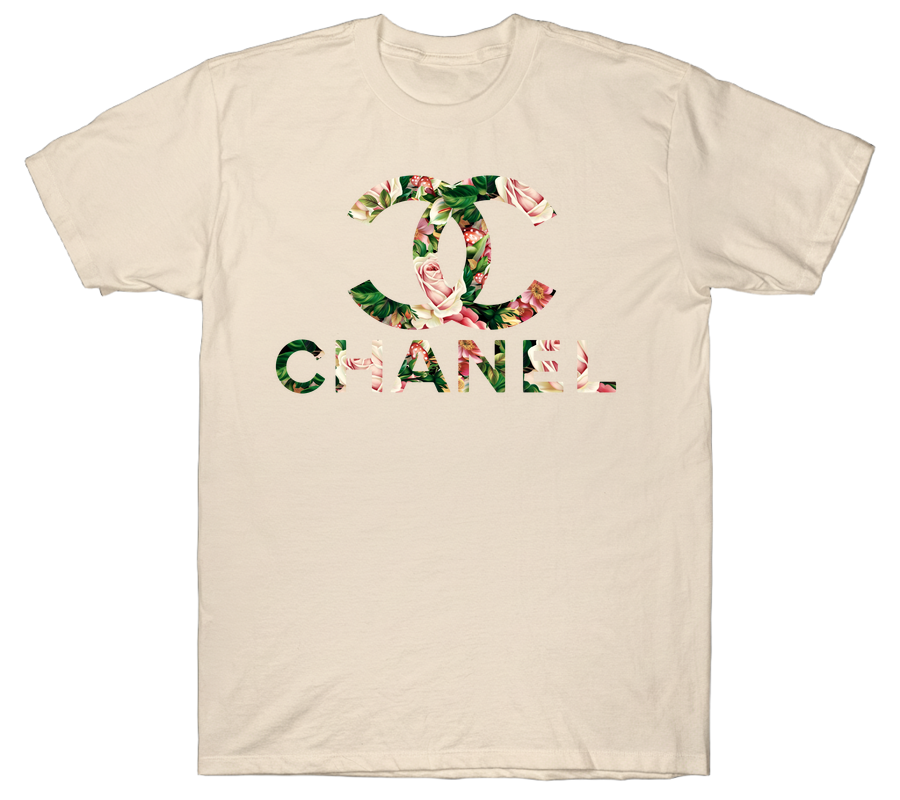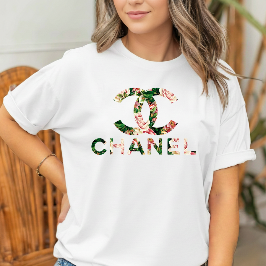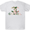 Elevate your casual wardrobe with this stunning floral-infused graphic tee. The design features the iconic interlocking “C” emblem and bold “CHANEL” lettering, both artistically filled with a lush botanical print. The artwork showcases soft pink roses, vibrant green foliage, and delicate red accents, creating a romantic contrast against the crisp white background. Centered prominently on the chest, this print blends luxury branding with natural beauty for a fresh, feminine aesthetic. It is an eye-catching piece that pairs effortlessly with denim or a sleek skirt for a chic, high-fashion vibe.
