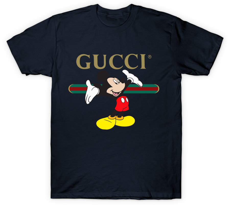 Elevate your casual wardrobe with this playful yet luxurious graphic tee. The centerpiece features the iconic Mickey Mouse in his classic stance, arms wide open and smiling, layered dynamically over a signature green and red horizontal web stripe. Above this colorful scene, the GUCCI logotype stands out in a sophisticated metallic gold serif font, bridging high fashion with nostalgic pop culture. Set against a crisp white background, Mickey’s vibrant red shorts and yellow shoes create an eye-catching contrast against the vintage-inspired branding. It is a perfect statement piece that blends whimsical charm with designer streetwear aesthetics, looking effortless whether paired with fitted denim or layered under a blazer.
