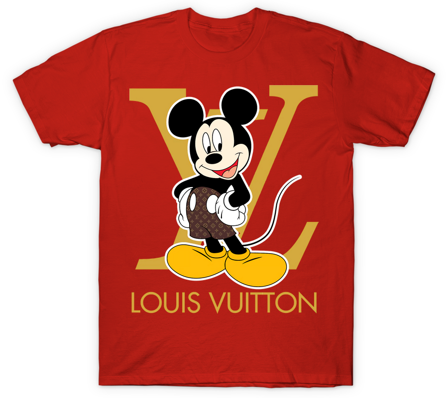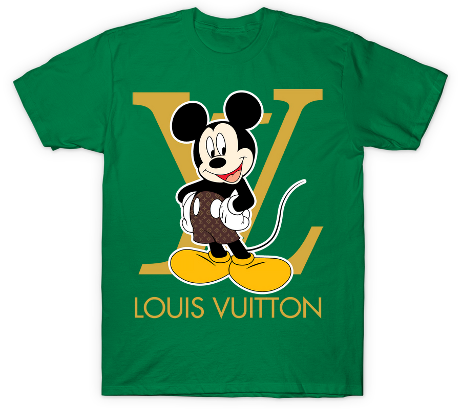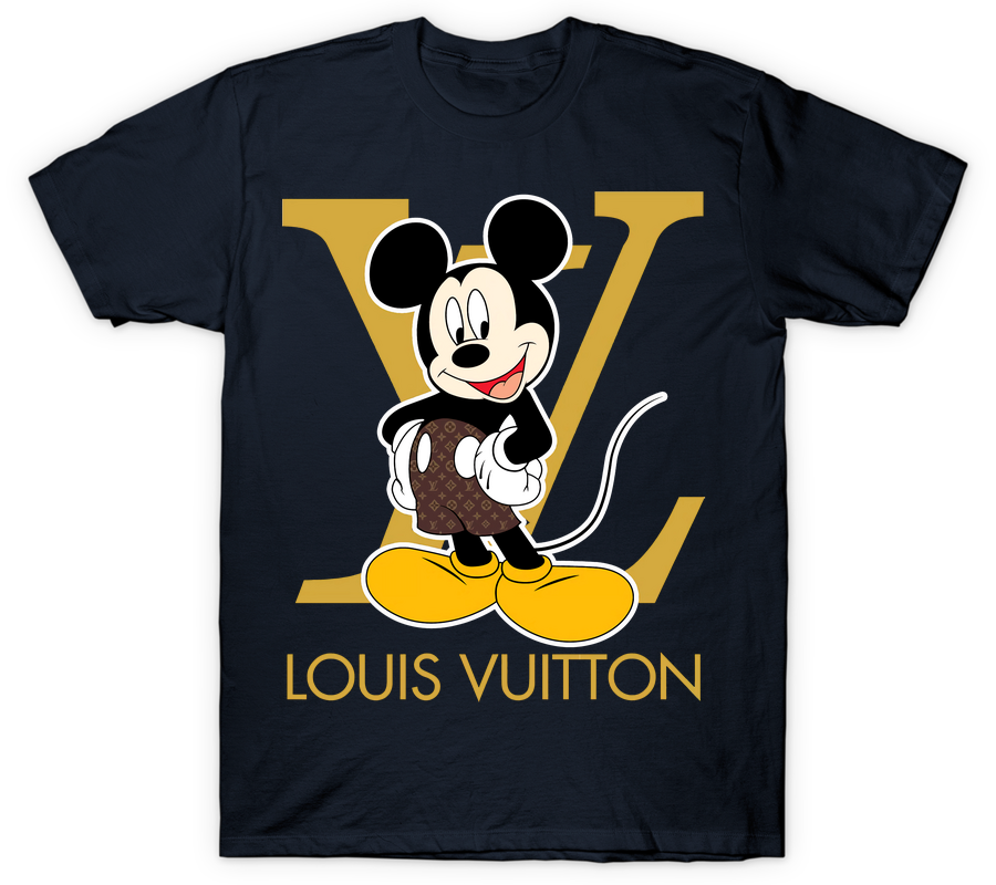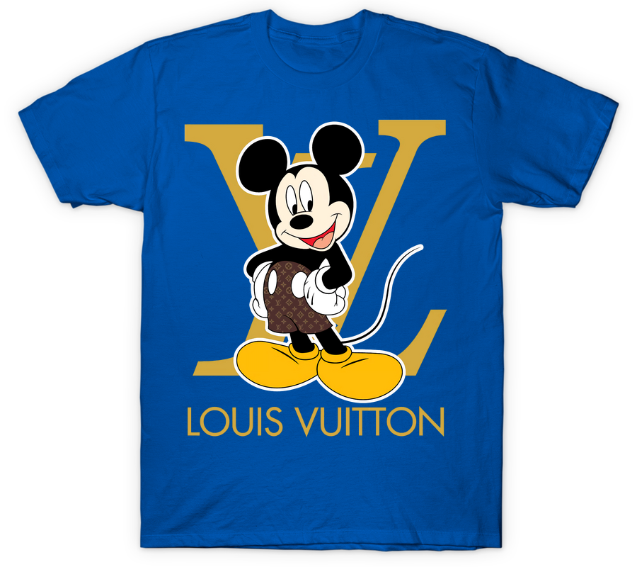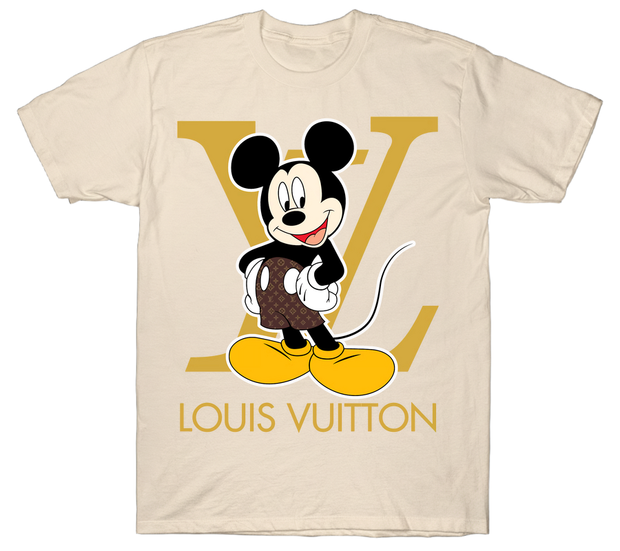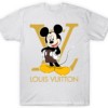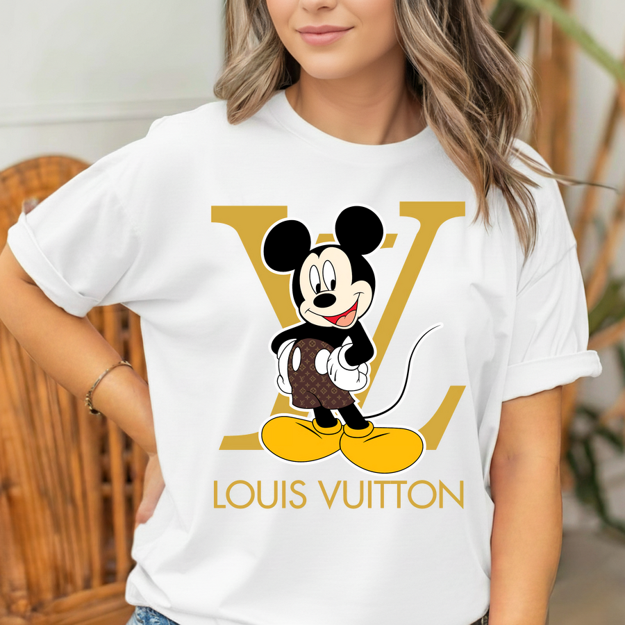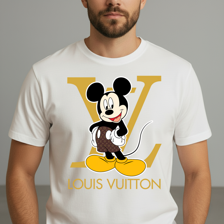 Add a touch of playful luxury to your wardrobe with this eye-catching graphic tee. The design features the iconic Mickey Mouse striking a cheerful pose, layered creatively over a massive, golden ‘LV’ monogram logo. Instead of his classic red shorts, Mickey sports a stylish pair featuring the signature brown Louis Vuitton monogram pattern, blending pop culture fun with high-end fashion aesthetics. Completed with bold ‘LOUIS VUITTON’ text underneath in matching gold, the artwork sits prominently on the chest against a clean white background. It’s the perfect statement piece for casual outings or streetwear-inspired looks.