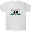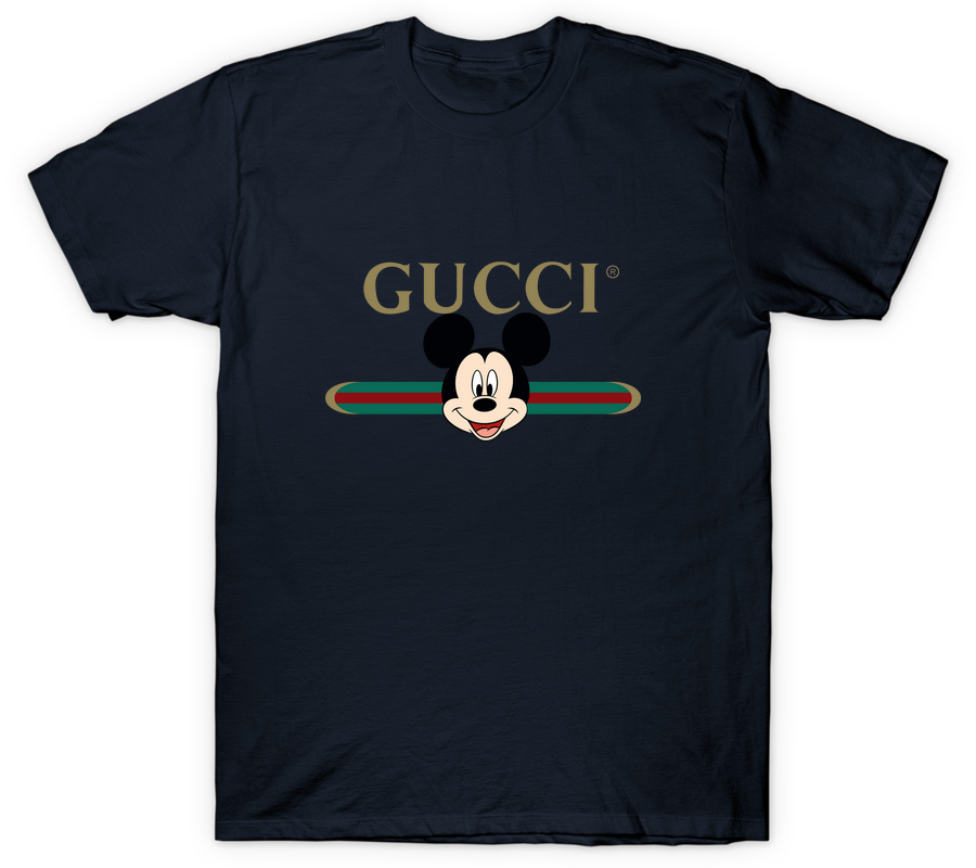 Add a touch of whimsy to your wardrobe with this iconic graphic tee. The design showcases a vintage-inspired “GUCCI” logo in elegant gold serif lettering across the chest, perfectly blending luxury with pop culture. Centered below is a cheerful illustration of Mickey Mouse, his smiling face overlapping the signature green and red web stripe. The crisp white background makes the colors pop, creating a clean yet bold aesthetic. This piece captures a playful, retro vibe that pairs effortlessly with denim or tailored trousers for a relaxed, high-fashion look.