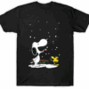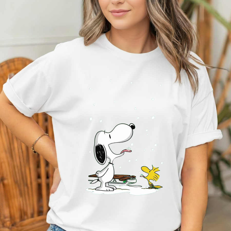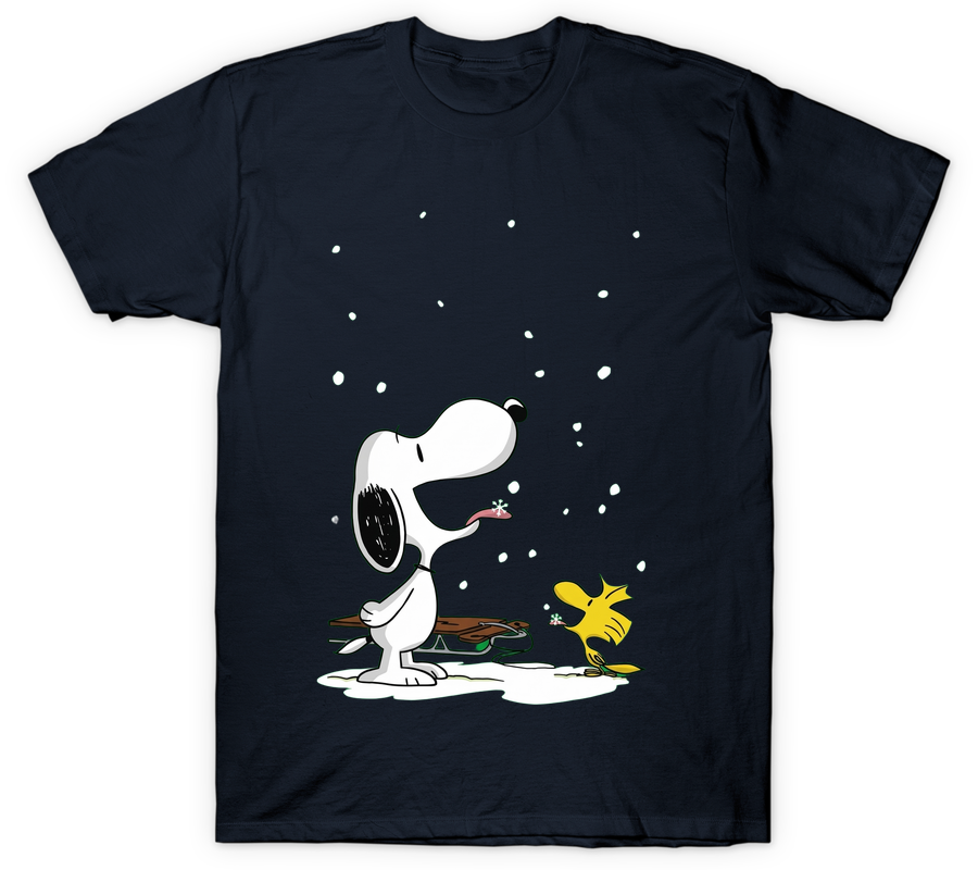 Embrace the joy of the season with this charming graphic tee featuring Peanuts favorites, Snoopy and Woodstock. Set against a classic black backdrop, the illustration showcases Snoopy leaning back with his tongue out, eager to catch a delicate snowflake, while little Woodstock stands by his side joining in the winter fun. A rustic wooden sled resting behind them adds a touch of nostalgic holiday spirit to the scene. The crisp white snow and bright yellow accents pop beautifully against the dark fabric, creating a heartwarming design perfect for cozy winter days and festive gatherings.