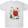 Capture the magic of a Peanuts Christmas with this delightful graphic tee. Centered on the chest, Snoopy sits atop his iconic red doghouse, donning a Santa hat amidst a gentle snowfall. The doghouse is festively adorned with colorful string lights and a green stocking, while a decorated Christmas tree stands proudly nearby. Surrounding the scene, a playful flock of Woodstocks dressed as tiny reindeer and elves spread holiday cheer, carrying gifts and fluttering through the air. Printed in vibrant reds, greens, and yellows, this heartwarming design brings a nostalgic and joyful vibe to your seasonal wardrobe.